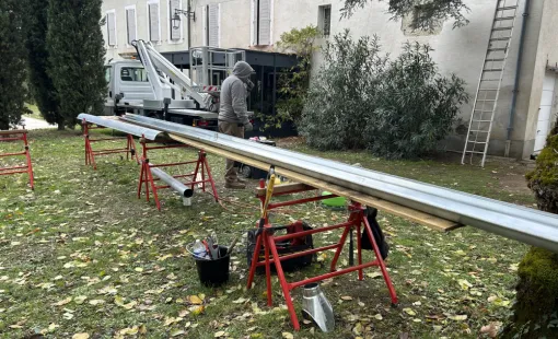 Sur cette photo, vous pouvez voir notre poste de travail aménagé spécialement pour la préparation des gouttières avant leur pose sur crochets, sur un…