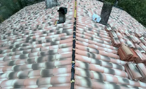 Sur cette photo, on peut voir un exemple de pose soignée où les tuiles sont parfaitement alignées, en respectant le pureau latéral. Chaque rang est tiré bien droit pour garantir à la fois une…