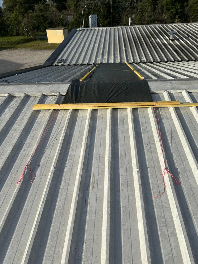 Nous sommes de nouveau intervenus en urgence à Revel sur une toiture en panneaux sandwich bac acier endommagée suite à une effraction. Objectif : sécuriser les lieux et rétablir une étanchéité provisoire en attendant la réparation définitive.