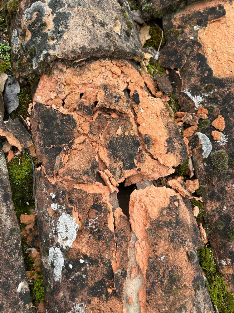 Sur la photo, on voit des tuiles qui ont feuilleté sous l’effet du gel. Avec l’âge et la mousse, la terre cuite devient poreuse, se délamine et finit par se casser. Résultat : risque d’infiltrations, dégâts sur l’isolation, les plafonds et les murs.